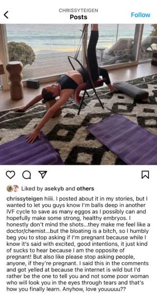 Media personality Chrissy Teigen announced that she and John Legend are trying to conceive again. She took to Instagram to let her followers know that she’s undergoing another round of In Vitro Fertilization (IVF).