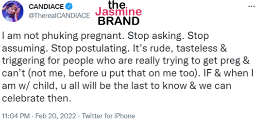 “I am not phuking pregnant. Stop asking. Stop assuming. Stop postulating. It’s rude, tasteless & triggering for people who are really trying to get preg & can’t (not me, before u put that on me too). IF & when I am w/ child, u all will be the last to know & we can celebrate then.”