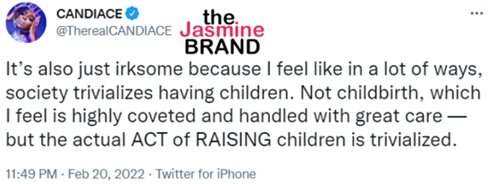 “It’s also just irksome because I feel like in a lot of ways, society trivializes having children. Not childbirth, which I feel is highly coveted and handled with great care — but the actual ACT of RAISING children is trivialized.”