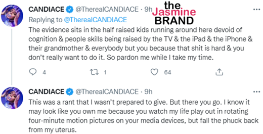 “The evidence sits in the half raised kids running around here devoid of cognition & people skills being raised by the TV & the iPad & the iPhone & their grandmother & everybody but you because that shit is hard & you don’t really want to do it. So pardon me while I take my time.”