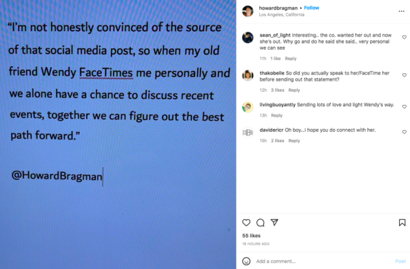 Despite the IG page being verified and reportedly run by Wendy herself, Bragman doesn’t believe this post came from his friend. He hinted that he believes someone else made the post. He said,