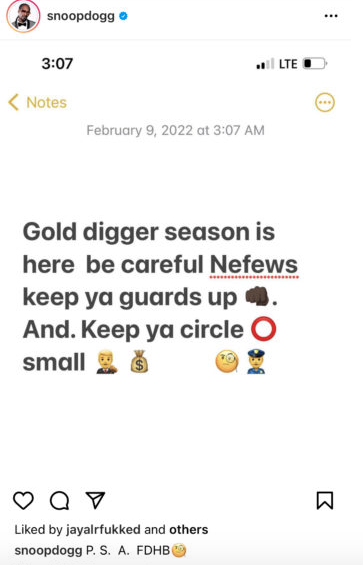 “Gold digger season is here be careful Nefews keep ya guards up. And. Keep ya circle small”