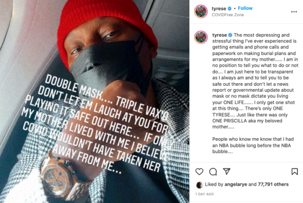 “The most depressing and stressful thing I’ve ever experienced is getting emails and phone calls and paperwork on making burial plans and arrangements for my mother…… I am in no position to tell you what to do or not do…. I am just here to be transparent as I always am and to tell you to be safe out there and don’t let a news report or governmental update about mask or no mask dictate you living your ONE LIFE……. I only get one shot at this thing…. There’s only ONE TYRESE…. Just like there was only ONE PRISCILLA aka my beloved mother…..