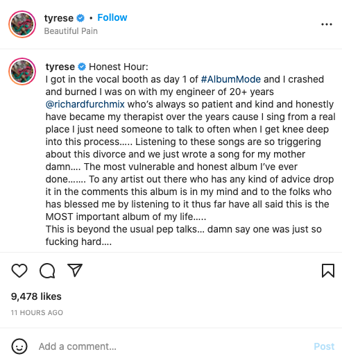 Tyrese goes on the end the post announcing that the title of his next album is Beautiful Pain, and says he hopes that he doesn’t become too afraid of the emotions of it all that he never releases it.
