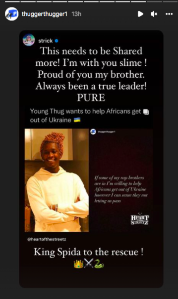 It seems like Young Thug, 30, has seen the discrimination reports and is ready to do what he can to help out. Yesterday the “Solid” rapper took to his Instagram stories and shared that he wants to assist with getting Africans out of Ukraine. He continued and asked for his fellow rappers to pitch in as well.