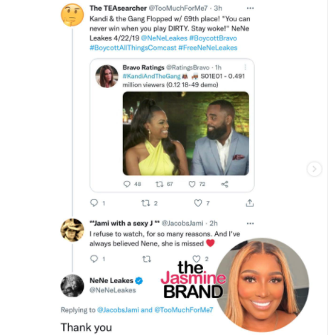 After a fan responded to a tweet alleging that Kandi Burruss new show “Kandi & The Gang” debuted in 69th place amongst Bravo show ratings, Nene Leakes responded thanking the fan for showing her support, and seemingly responded to Kandi’s alleged ratings premiere.