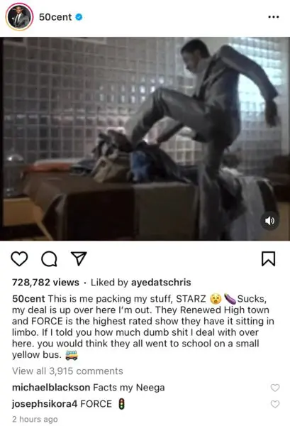 “This is me packing my stuff, STARZ. Sucks, my deal is up over here I’m out. They renewed High Town, and FORCE is the highest rated show they have sitting in limbo. If I told you how much dumb sh*t I deal with over here, you would think they all went to school on a small yellow bus.”