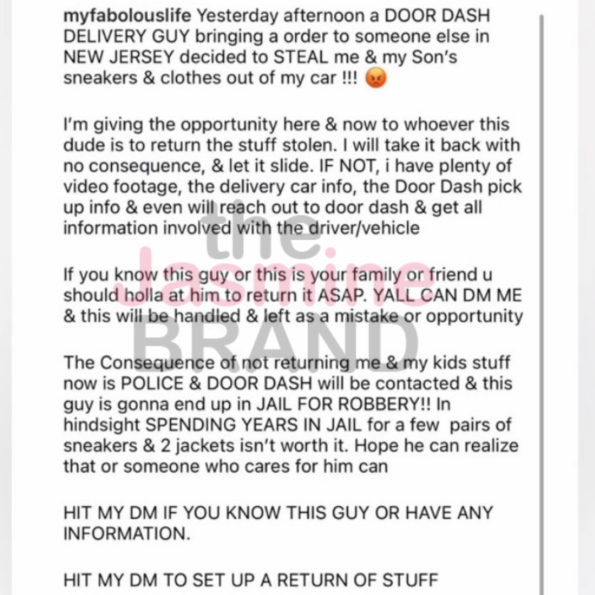 “Yesterday afternoon a DOOR DASH DELIVERY GUY bringing a order to someone else in NEW JERSEY decided to STEAL me & my Son’s sneakers & clothes out of my car !!!”