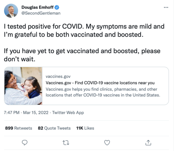 Doug Emhoff, 57, is the latest public figure to test positive for the coronavirus. Doug Emhoff, the second gentleman of the United States and husband to Vice President Kamala Harris, confirmed this on March 15 in a message shared on his Twitter. He noted he was experiencing light symptoms and said he was “grateful” to have been vaccinated. He wrote: