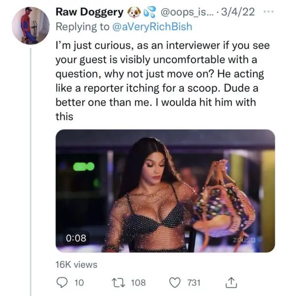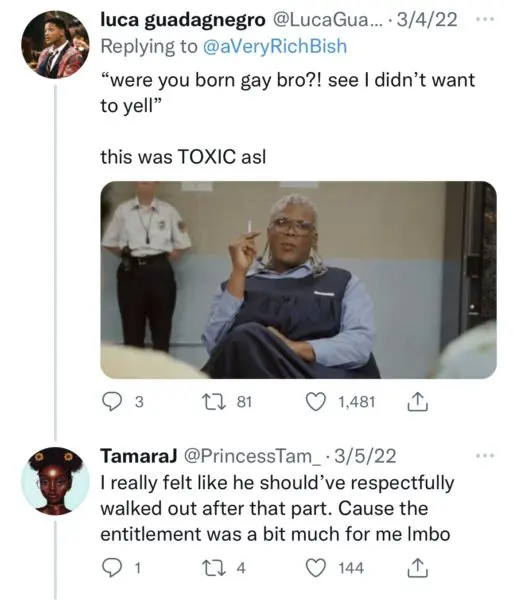 He ends with asking the actor if he’s ever been with a woman. Bellomy replies,