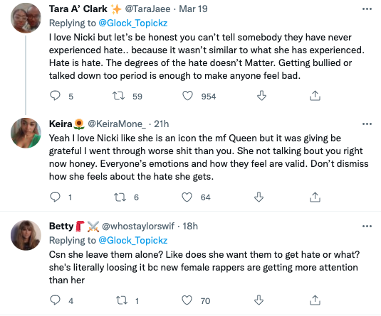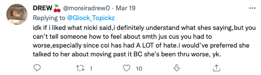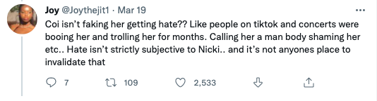 Nicki goes on to explain to Coi that she can’t focus on the hate, as it just comes with being great in the music industry. However social media users quickly accused the rap giant of attempting to invalidate Coi’s experience.