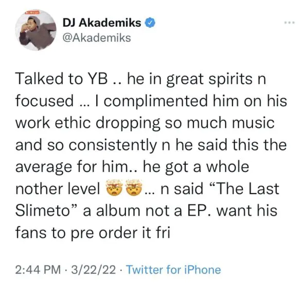 “Talked to YB .. he in great spirits n focused … I complimented him on his work ethic dropping so much music and so consistently n he said this the average for him.. he got a whole nother level … n said “The Last Slimeto” a album not a EP. want his fans to pre order it fri.”
