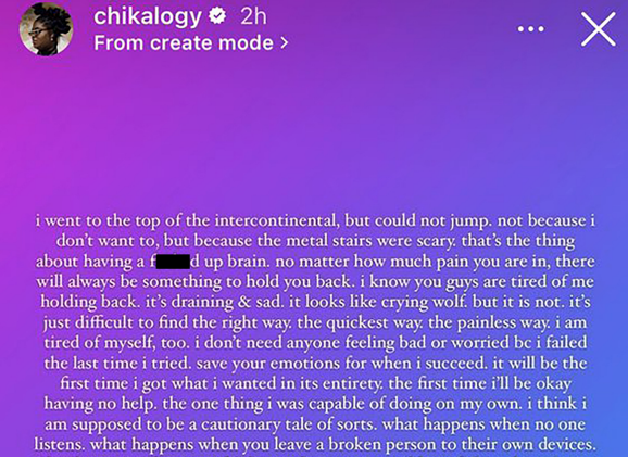 Grammy nominated artist Jane Chika Oranika, known by her stage name Chika, is seemingly dealing with some tough mental health struggles. In a recent instagram post, the artist implied that she recently tried to jump off of the “Intercontinental”, but was stunted by “scary metal stairs”. The young rapper detailed the attempt writing: