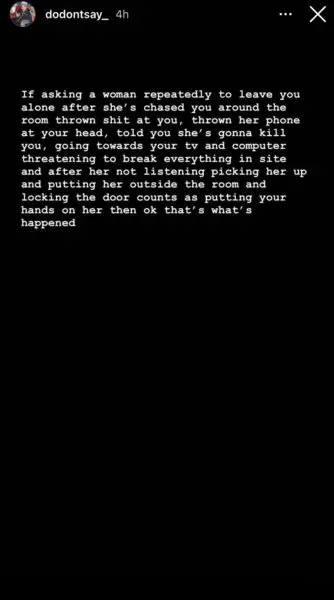 If asking a woman repeatedly to leave you alone after she’s chased you around the room thrown shit at you, thrown her phone at your head, told you she’s gonna kill you, going towards your tv and computer threatening to break everything in site and after her not listening picking her up and putting her outside the room and locking the door counts as putting your hands on her then ok that’s what’s happened.”