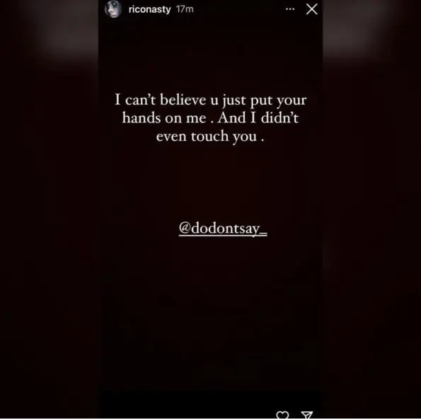 “@riconasty You’ve painted a picture that i hit you last night and that’s a lie I didn’t put my hands on you You attacked me And i asked you to leave and you wouldn’t so i got you out my room and locked the door Your legit crazy! You posted that bullshit ass lie and deleted it seconds later because your cap You a liar and you fasho ain’t shit for this one Stop tryna trash my name bro That’s shit ain’t cool You can be mad all you want about the relationship but don’t label me a woman beater That’s not at all what it is.”