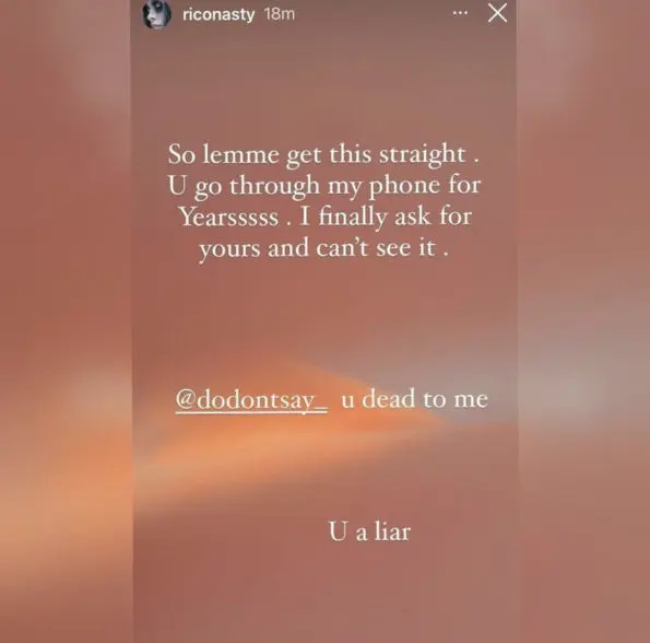 “So lemme get this straight. U go through my phone for yearsssss. I finally ask for yours and can’t see it. @dodontsay_ u dead to me. u a liar.”
