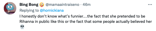 However Rihanna fans on social media trolled the crazed fans for believing the imposter. Criticising the stunt for being “weird” and pointing out their clear differences: