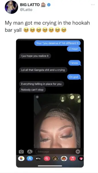 Latto took to Twitter to post a screenshot that revealed an exchange between her and her man with a picture of herself crying in the hookah bar from excitement.