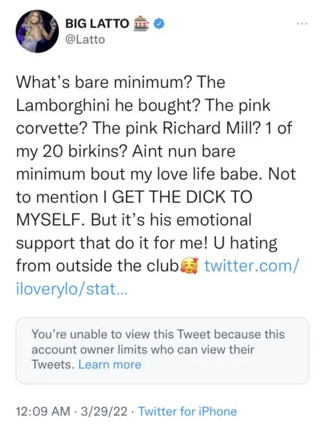 “What’s bare minimum? The Lamborghini he bought? The pink corvette? The pink Richard Mill? 1 of my 20 birkins? Aint nun bare minimum bout my love life babe. Not to mention I GET THE D*CK TO MYSELF. But it’s his emotional support that do it for me! U hating from outside the club [smiling hearts emoji].”