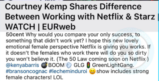 Despite her switch to Netflix seemingly being a peaceful transition, it now looks like 50 Cent isn’t too happy with Kemp’s recent comments regarding her exit from Starz. During an interview that took place earlier this month at the 15th annual Essence Black Women in Hollywood luncheon, Kemp shared what she believes to be the biggest difference between the two powerhouse Networks. She said,