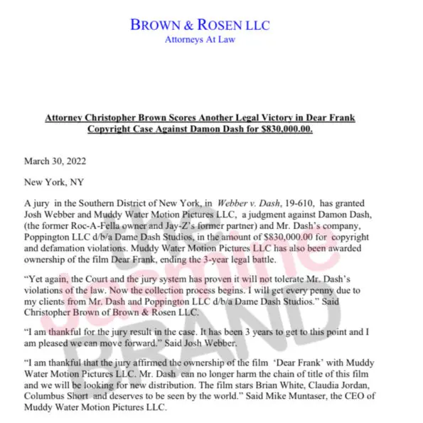 They also claim that Dame Dash sent promo material of the movie to media outlets like BET, but changed the title from “Dear Frank” to “The List.” They cut ties with him in 2018 and completed the movie on their own without Dash. The entrepreneur/record exec fired back, claiming they shot the movie at his house and used his equipment, before stealing the footage to work on it without him.