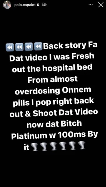 “Back story Fa Dat video I was Fresh out the hospital bed From almost overdosing Onnem pills I pop right back out & Shoot Dat Video now dat B-tch Platinum w 100ms By it”