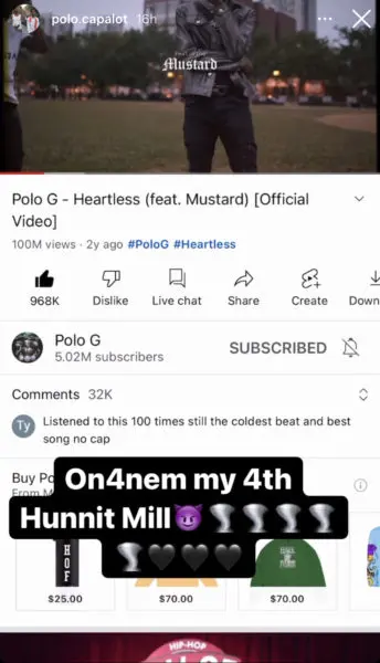 The post comes after the Pop Out rapper took to his Instagram story to enjoy the moments leading up to his platinum single, Heartless, reaching 100 million views on YouTube. Within about two hours, the Heartless music video gained over 700 views. The milestone makes this Polo G’s fourth music video with over 100 million views on YouTube, including Rap Star, Finer Things and Pop Out.