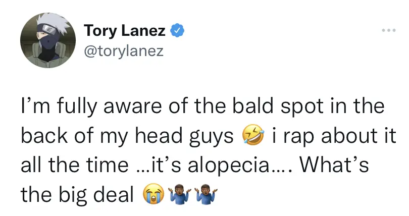On Twitter, Tory Lanez claimed that it’s the result of alopecia, an autoimmune disorder that affects hair growth.