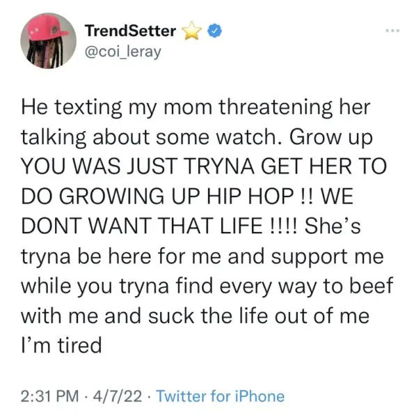 Coi Leray, 24, began her career by posting music on SoundCloud, inspired by father, record producer and media mogul Benzino, 56. The father and daughter have been on a rocky relationship following Coi Leray’s uprise to success in hip hop. In the midst of the rapper and singer preparing to drop her debut album Trendsetter at midnight (April 8), Coi took to Twitter to call out her father Benzino in a series of tweets.
