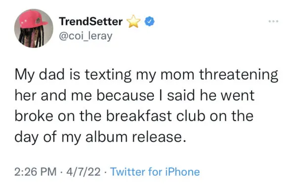 “My dad is texting my mom threatening her and me because I said he went broke on the breakfast club on the day of my album release.”