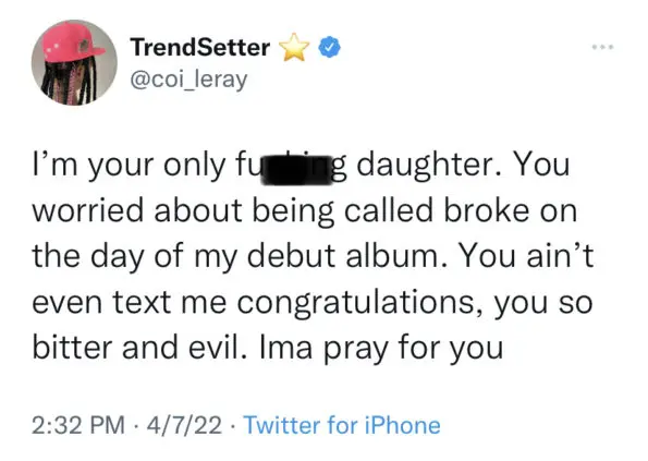 “I’m your only f-k-ng daughter. You worried about being called broke on the day of my debut album. You ain’t even text me congratulations, you so bitter and evil. Ima pray for you.”