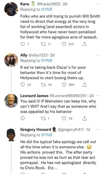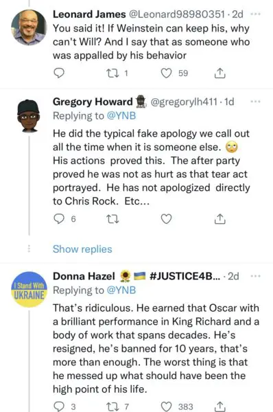 “Nope. This ain’t it. Will has apologized repeatedly, resigned from the academy, can’t attend any events for TEN years and has lost his work opportunities. When is it enough?!”