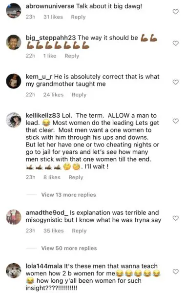“A woman for me is, handling your own but knowing how to cater to a man’s needs. And I think a lot of times when you get that ascetic of ‘I’m a boss b*tch, Imma this, Imma that.’ No baby! But you can’t cook. You don’t know when to be quiet! You don’t know how to allow a man to lead.”