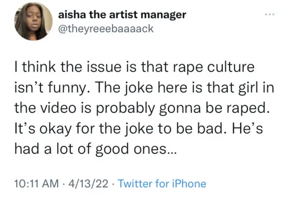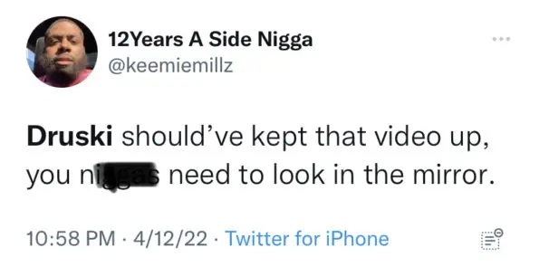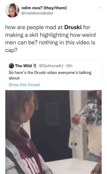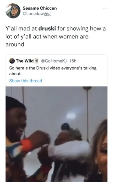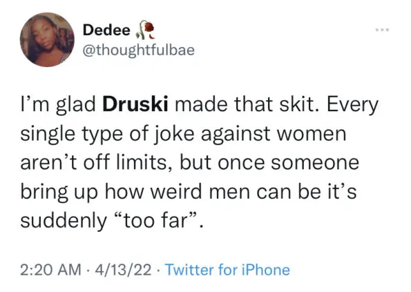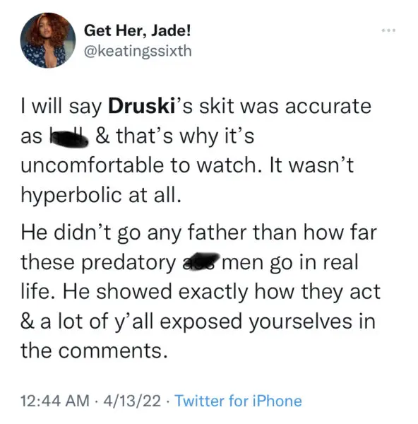 After uploading the skit, the comedian faced unpleasant reactions from fans who weren’t fond of the imitation, which caused him to take down the video. In addition to the controversial topic surrounding the skit, the quick post and delete sparked people to chime in on the questionable portrayal of men. Some users agreed with the skit, saying it’s exactly what men need to see, while others argued Druski should be canceled for being insensitive toward actual victims of the behavior.