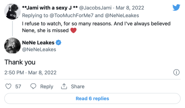 “Thank you,” NeNe Leakes wrote in response to the tweet, with many interpreting it as shade toward Burruss and her show.