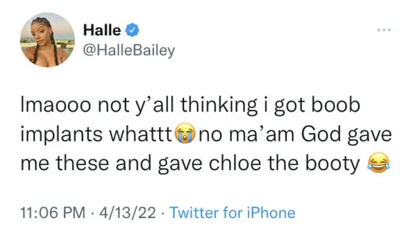 The 22-year-old artist took to Twitter on April 14 to shut down rumors that she recently got breast implants. Not holding back, Halle Bailey tweeted,