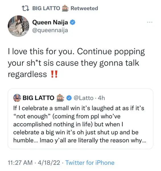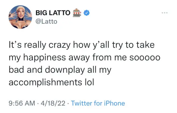 However, it appears not everyone is here for Latto’s climb to success. On Sunday (April 17), Latto took to Twitter to address a situation that appears to have stemmed from the celebration of her recent accomplishment. The tweets in question began after the rapper acknowledged the exciting news. She tweeted,