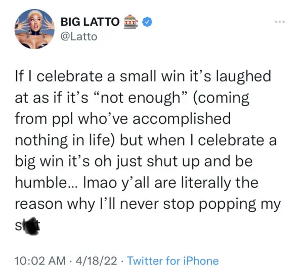 “If I celebrate a small win it’s laughed at as if it’s “not enough” (coming from ppl who’ve accomplished nothing in life) but when I celebrate a big win it’s oh just shut up and be humble… lmao y’all are literally the reason why I’ll never stop popping my sh*t.”