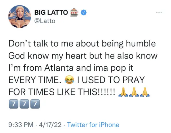 “Don’t talk to me about being humble God know my heart but he also know I’m from Atlanta and ima pop it EVERY TIME. I USED TO PRAY FOR TIMES LIKE THIS!!!!!!”