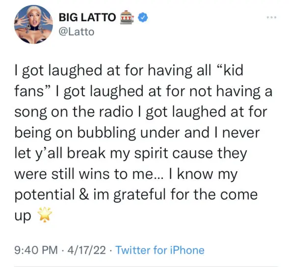 “I got laughed at for having all “kid fans” I got laughed at for not having a song on the radio I got laughed at for being on bubbling under and I never let y’all break my spirit cause they were still wins to me… I know my potential & im grateful for the come up.”