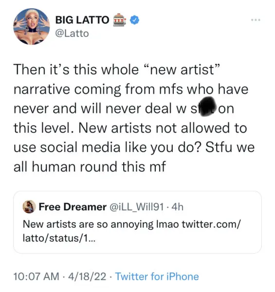 “Then it’s this whole “new artist” narrative coming from mfs who have never and will never deal w sh*t on this level. New artists not allowed to use social media like you do? Stfu we all human round this mf.”