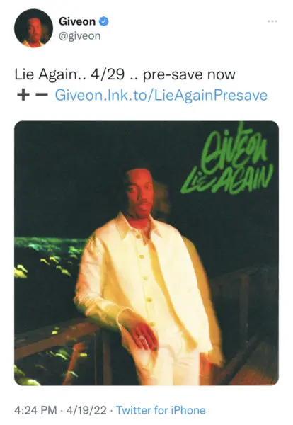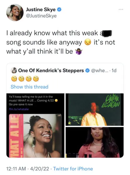 On April 13, Justine announced she would be putting her feelings into her music with upcoming single “What A Lie” releasing on April 22. Eventually, her former lover Giveon took to Twitter to also announce his upcoming single “Lie Again,” which will be available a week later on April 29.