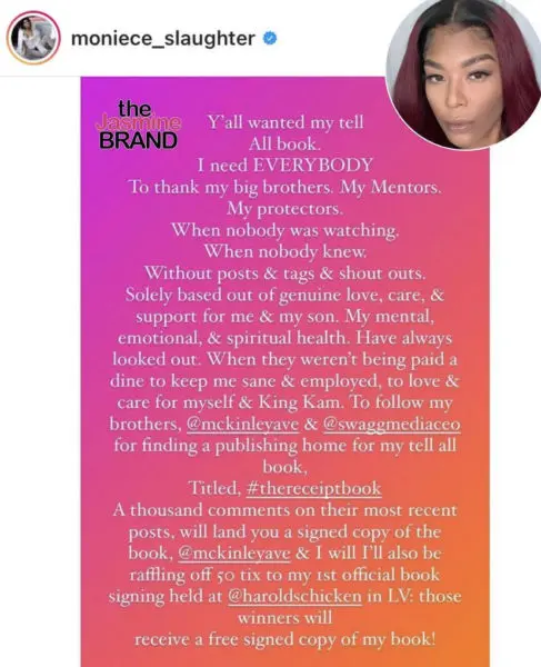 Moniece Slaughter, 35, recently announced via her Instagram story she will be publishing her first tell-all book entitled “The Receipt Book.” She also shared with followers that a thousand comments on IG would present them with a signed copy of the book.