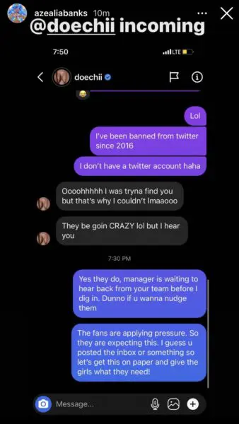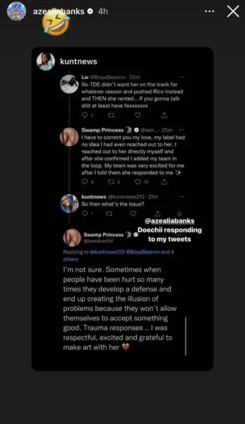 In an attempt to set things straight, Doechii interacted with fans via Twitter answering questions about the controversial collaboration. According to the “Crazy” artist, her team had no idea she reached out to Banks, but were excited for her upon finding out she responded. She also added that she’s unsure of the issue surrounding the collaboration. Banks has since responded to Doechii’s claims with a repost via her IG stories captioned with a laughing emoji.