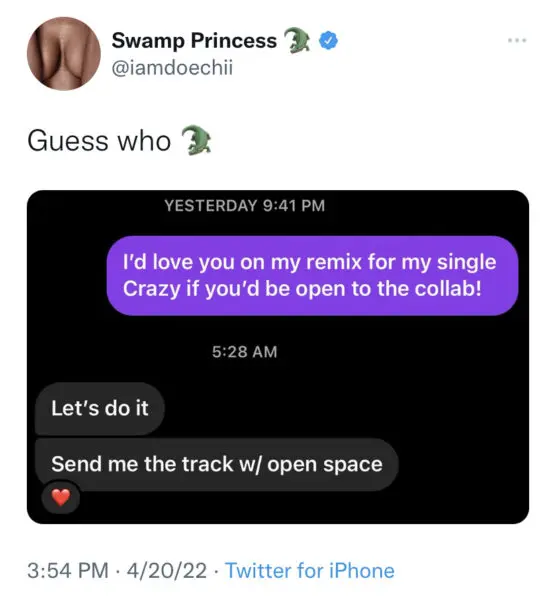 “I’d love you on my remix for my single Crazy if you’d be open to the collab!”