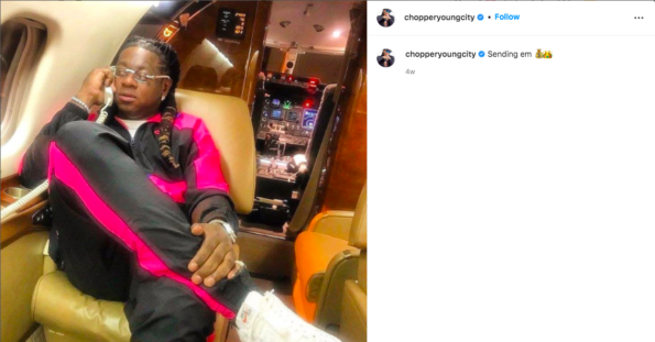 The undercover cop added that after searching Chopper’s IG account they noticed several posts related to prostitution and pimping. In one of the questionable posts, the former reality star is on the phone while inside a private jet. He captioned the post,