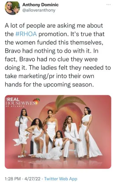 “A lot of people are asking me about the #RHOA promotion. It’s true that the women funded this themselves, Bravo had nothing to do with it. In fact, Bravo had no clue they were doing it. The ladies felt they needed to take marketing/pr into their own hands for the upcoming season.”