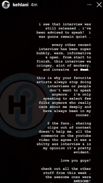 The “Alter” singer continued, stating that fans and viewers on Youtube agreed that the interview’s questioning seemed overly intrusive. Additionally, Kehlani stated that she will be only be doing a small number of select interviews moving forward.