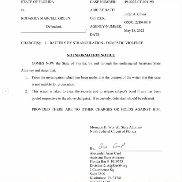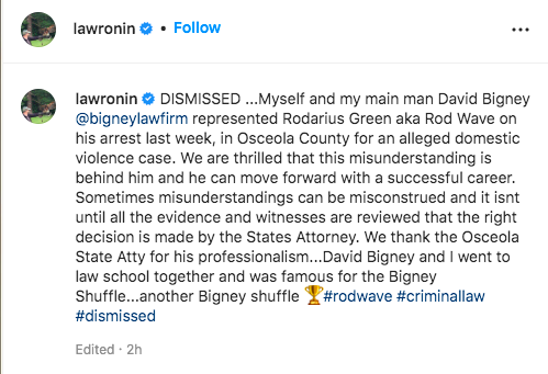 “DISMISSED …Myself and my main man David Bigney @bigneylawfirm represented Rodarius Green aka Rod Wave on his arrest last week, in Osceola County for an alleged domestic violence case. We are thrilled that this misunderstanding is behind him and he can move forward with a successful career. Sometimes misunderstandings can be misconstrued and it isnt until all the evidence and witnesses are reviewed that the right decision is made by the States Attorney. We thank the Osceola State Atty for his professionalism…David Bigney and I went to law school together and was famous for the Bigney Shuffle…another Bigney shuffle #rodwave #criminallaw #dismissed”