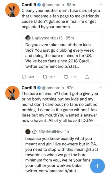 Fans even through claims that the internet celebrity does the “bare minimum” for her fan base, in which Cardi replied she doesn’t owe anyone anything besides her children and mother.